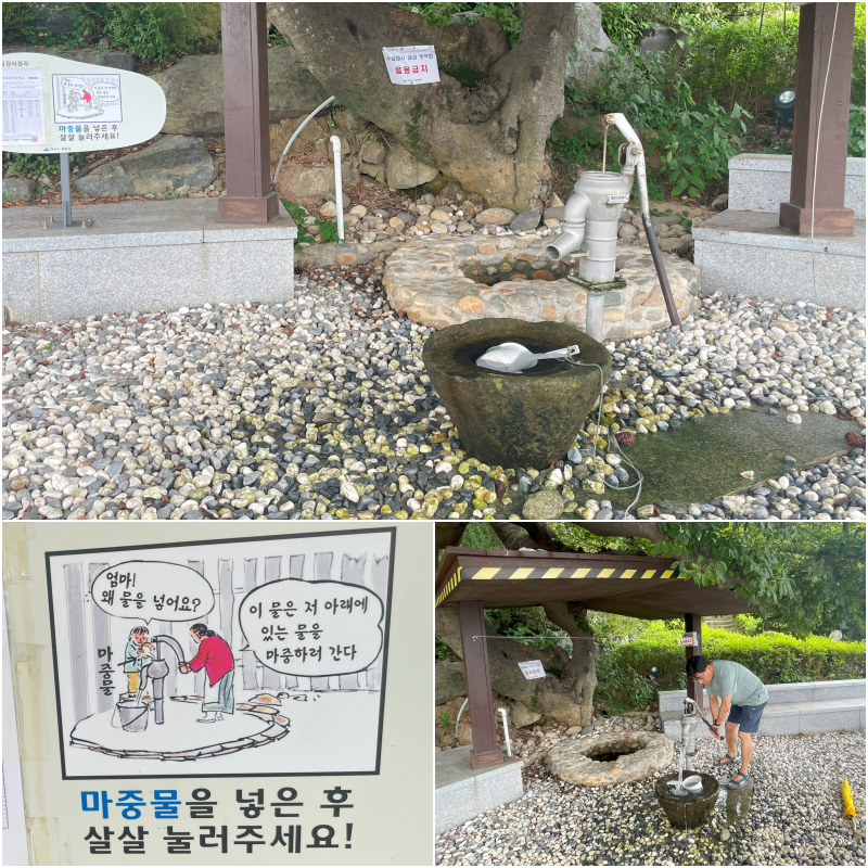 마중물을 넣고 펌프질을 하면 시원한 물이 콸콸 나온다. 음용이 불가한 점이 조금 아쉽다.