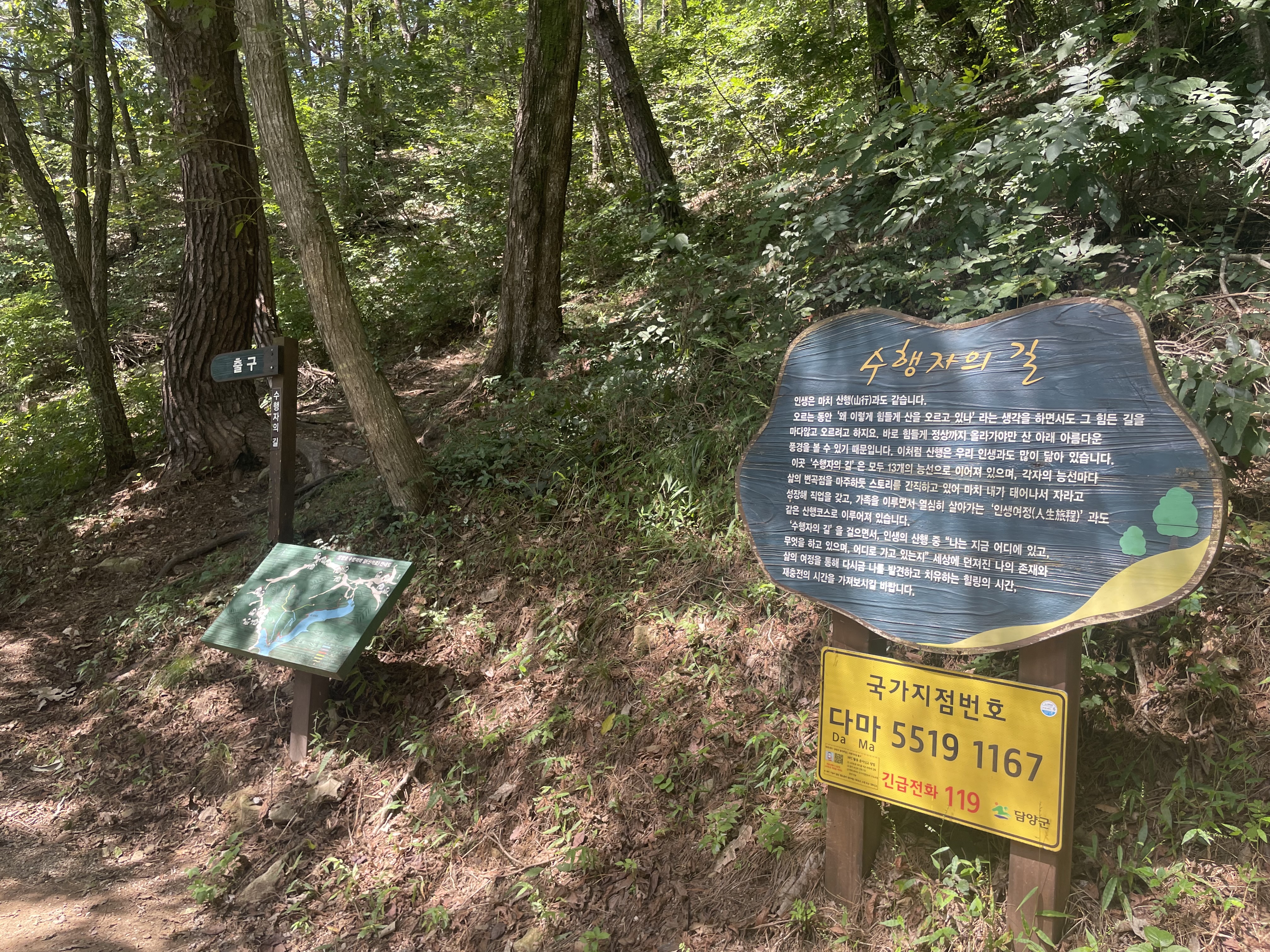 수행자의 길은 13개의 능선으로 이어져 있으며 각자의 능선마다 스토리를 가지고 있어 인생여정과도 같은 산행코스로 이루어져 있다. 이 곳은 출구이며 입구는 6쉼터 앞(1.8km)지점에 있다.