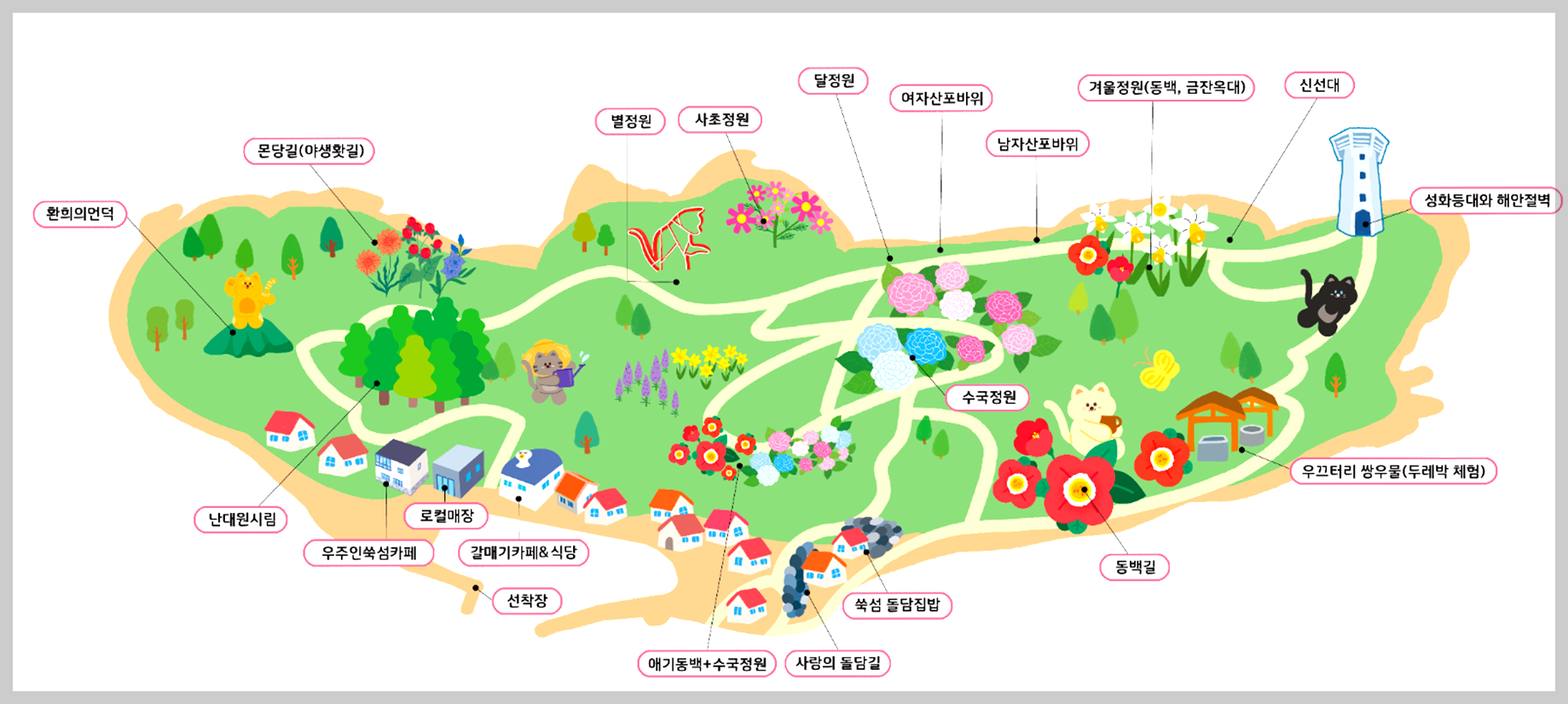 고흥 봉래면에 있는 힐링파크 쑥섬은 쑥이 향긋하고 질이 좋아 쑥섬이라 불리게 되었는데, '바다 위 비밀정원'이라는 별칭에 걸맞게 아름다운 자연 경관을 자랑한다. 수백 년 된 돌담길을 따라 걸으며 난대 원시림과 다채로운 정원 풍경을 만날 수 있다. 이 정원은 전남 1호 민간정원으로, 코티지정원과 4계절정원이 계절마다 다른 매력을 선보인다. 이곳은 한국관광 100선에 선정될 만큼 자연의 숨결이 살아있는 트레킹 코스를 제공하며, 섬에 사는 고양이들과 교감하는 특별한 경험을 할 수 있다. 수국이 개화하는 5~6월 성수기에는 관광객이 많이 몰리는 편인데 현재 쑥섬 도선은 1대가 늘어 총 2대가 운영 중이다.