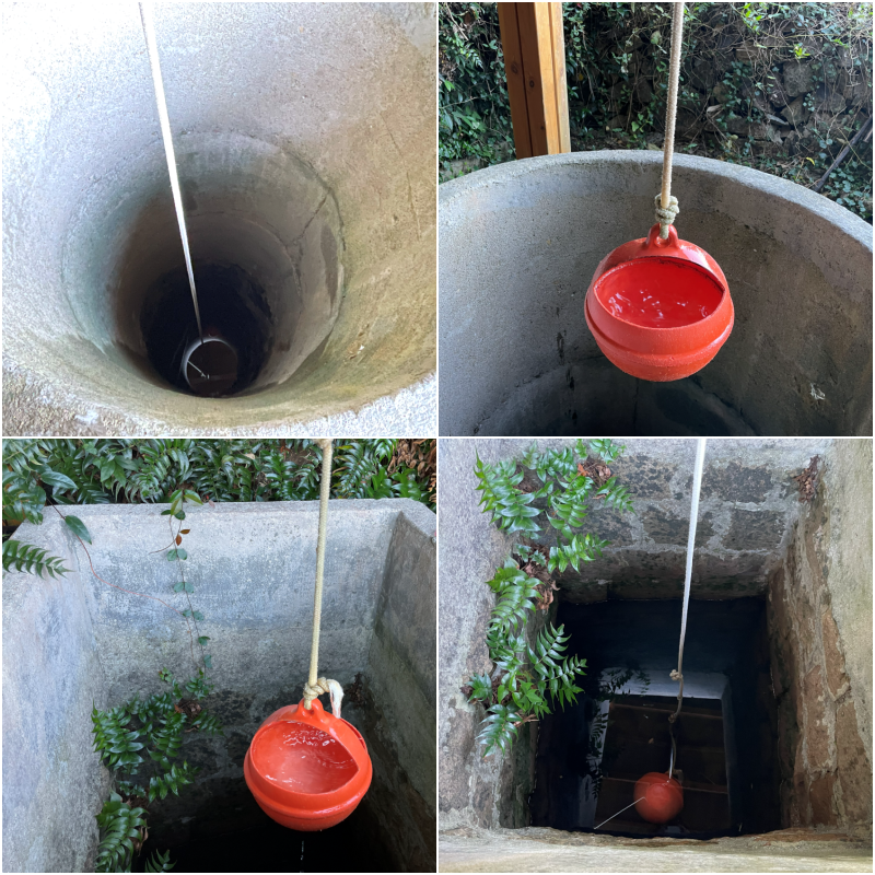 우울물을 길어볼 수 있도록 두레박이 있는데 도르레로 연결되어 있어 어렵지 않게 물을 길었다. 맑은 물이지만 손을 씻는 정도로 활용할 것을 권고하고 있다.