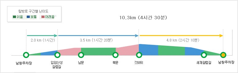 남창주차장-→남창탐방지원센터 → 새재갈림길 → 은선동삼거리 → 산성골 → 남문 → 습지 → 북문 → 거북바위 → 갓바위 → 삼나무군락지 → 은선골 → 은선동삼거리 → 남창주차장(원점회귀) 10.3km, 4시간 40분 소요(점심, 휴식 포함)