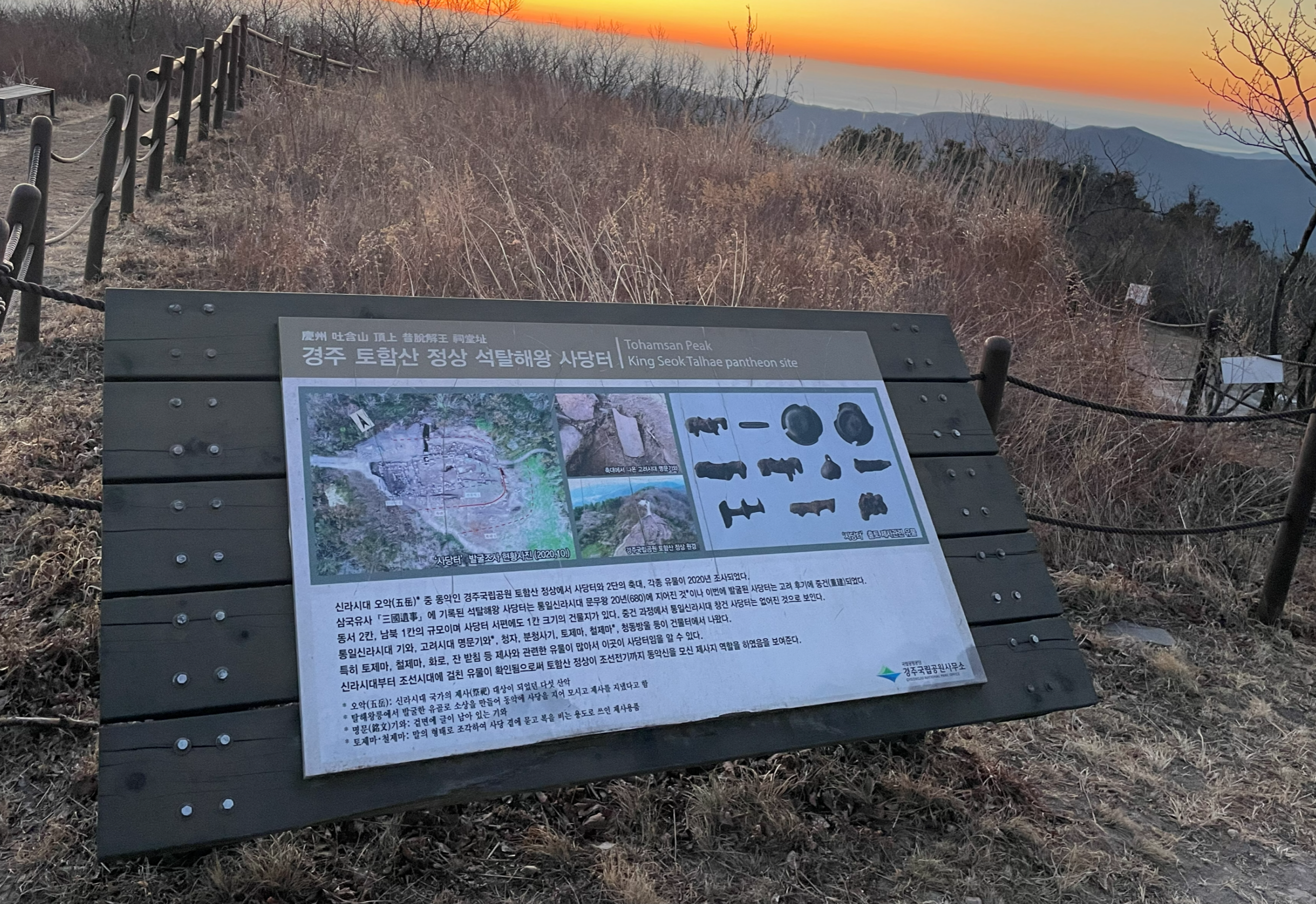 정상에는 신라 4대 임금인 탈해왕의 유골로 만든 소상을 문무왕이 모셨고, 제를 올렸다고 전해지는 곳. 신라시대부터 조선시대에 걸친 유물이 확인된 것으로 보아 토함산 정상이 조선전기까지 동악신을 모신 제사지 역할을 하였음을 보여준다.