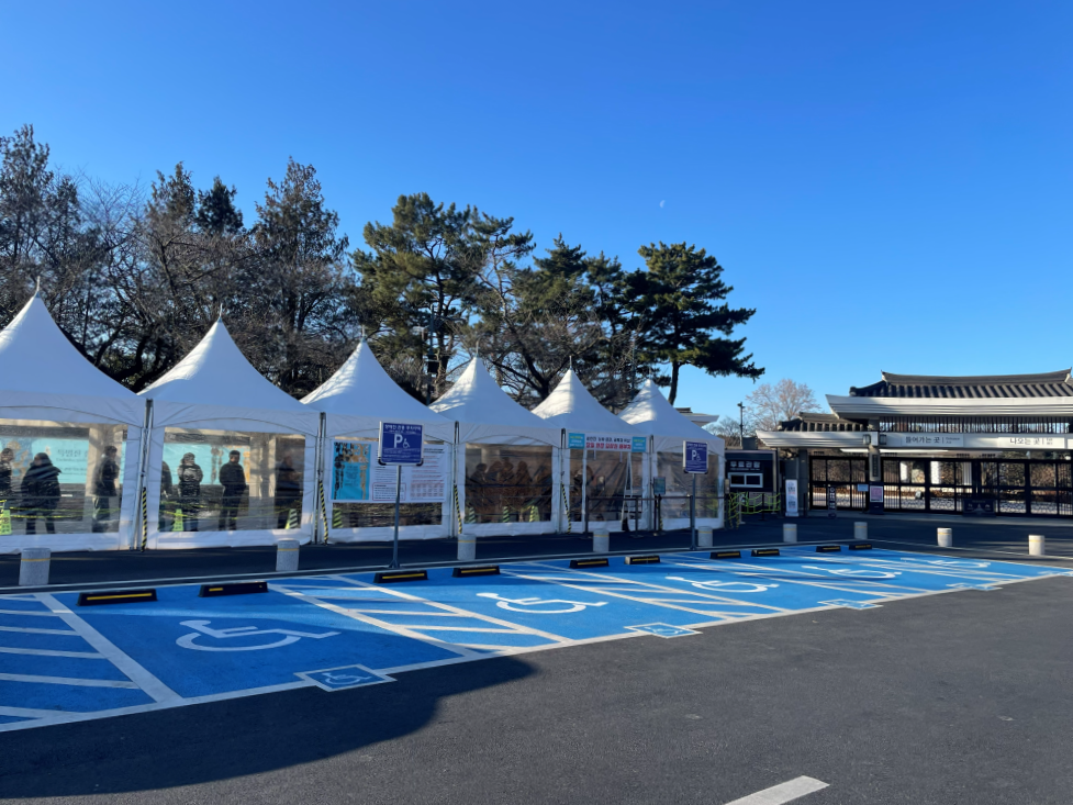 추운 날씨에 당일 입장권 배부를 기다리는 이들을 위한 천막이 설치되어 있다.