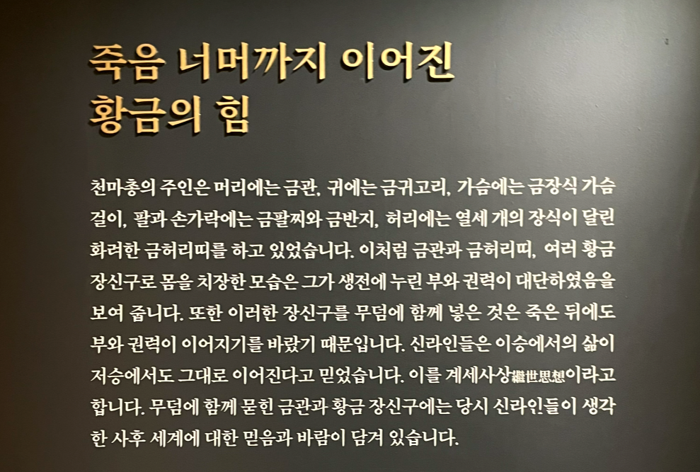 천마총에서 출토된 금관과 황금 장신구를 통해, 죽음 너머까지 이어진 황금의 힘을 소개하고 있다. 무덤의 주인이 머리부터 발끝까지 황금으로 장식된 모습은 생전의 부와 권력이 사후세계에서도 계속되기를 바랐던 신라인의 믿음을 전한다.