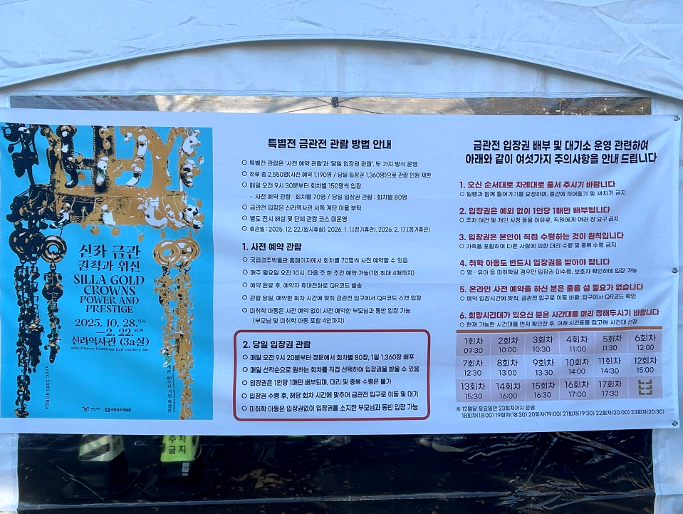 토함산 일출 산행을 마치고 신라 금관 특별전 입장권을 배부 받기 위하 경주 박물관으로 향했습니다. 사전 예매를 하지 못해 당일 아침 표를 받기 위해서입니다. 월요일 아침 일찍이라 다행히 아직 줄을 선 사람들은 많지 않아서 40분 정도를 기다려 9시 20분에 1회차 입장권을 배부받고 바로 입장을 했답니다.